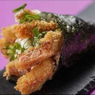 Delicioso temaki de salmão envolto na crocante massa harumaki, uma combinação perfeita de sabores e texturas.