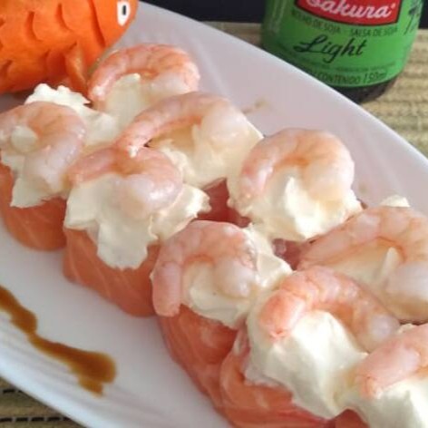Lamina de Salmão, natural ou maçaricado com Camarão e cream cheese.