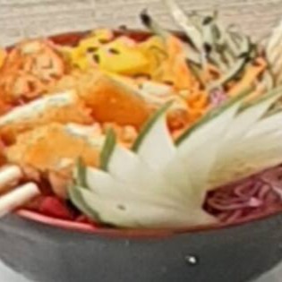 Salmão em cubo, camarão, atum, kani, manga, repolho roxo, pepino e gergelim