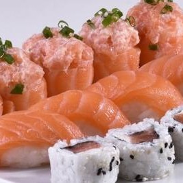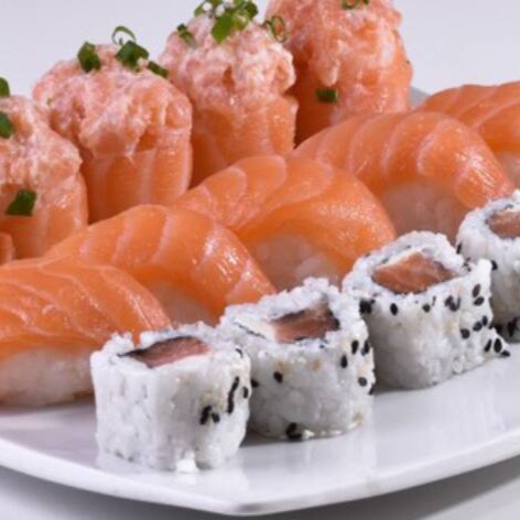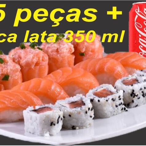 5 niguiri natural ou massaricado (bolinho de arroz coberto de lâmina de salmão), 5 joy joy natural ou massaricado (bolinho de arroz envolto por lâmina de salmão coberto por patê de salmão) e 5 filadeldia (enroladado de arroz por fora, cream cheese e recheio de salmão) ( se não fizer observação, vai natural).