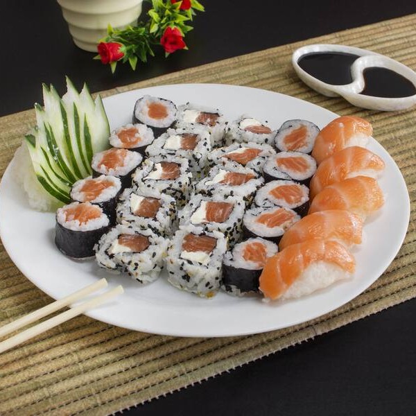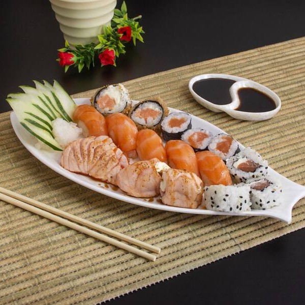 5 niguiri (bolinho de arroz coberto de lâmina de salmão), 5 joy joy (bolinho de arroz envolto por lâmina de salmão coberto por patê de salmão), 10 uramaki salmão e cream cheese e 10 hossomaki (arroz envolto de nori, recheio de salmão e cream cheese).