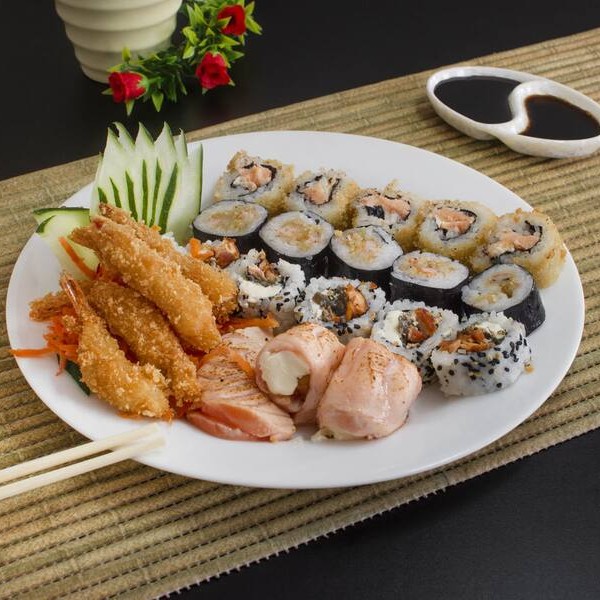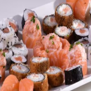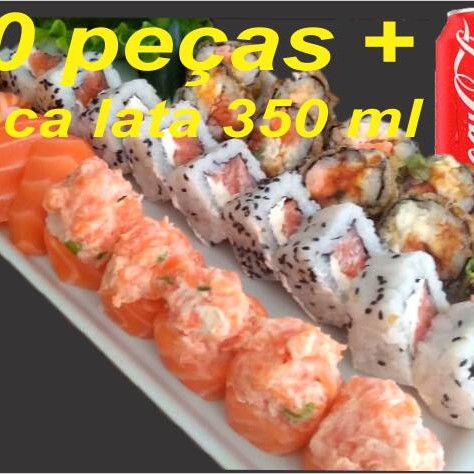 5 sashimi (lâminas de salmão), 5 joy joy natural ou massaricado (bolinho de arroz envolto por lâmina de salmão coberto por patê de salmão), 10 niguiri natural ou massaricado (bolinho de arroz coberto de lâmina de salmão), 10 uramaki salmão e cream cheese, 10 hossomaki (arroz envolto de nori, recheio de salmão e cream cheese) e 10 carioca salmão com cream cheese. ( se não fizer observação, vai natural)