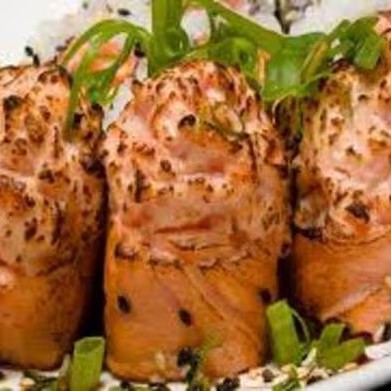 Lamina de salmão massaricado, camarão, salmão e kani crocante, cream cheese, cebolinha, gergelim e molho teryaki.