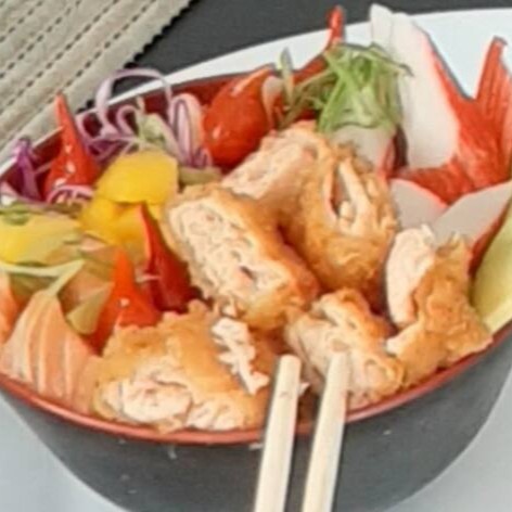 Salmão em cubo, camarão e kani empanado e frito, manga, pimenta biquinho, pepino e gergelim