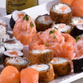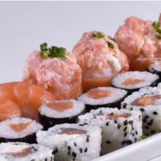 10 sashimi (lâminas de salmão), 10 joy joy (bolinho de arroz envolto por lâmina de salmão coberto por patê de salmão) e 10 niguiri (bolinho de arroz coberto de lâmina de salmão) ( se não fizer observação, vai natural).