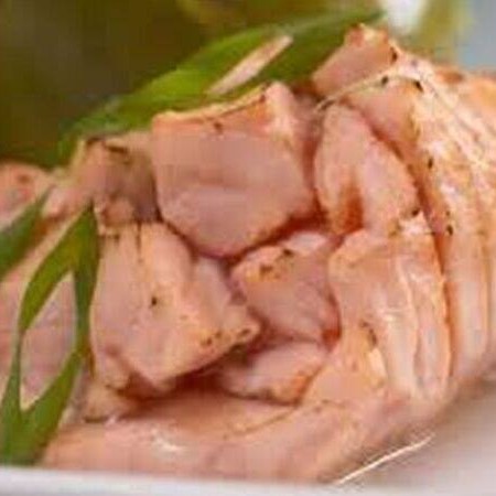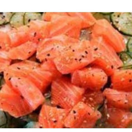 Salmão em cubo com cebolinha e gergelim.