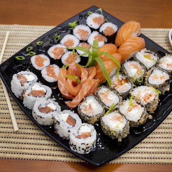 05 sashimi, 05 joy joy, 10 niguiri, 10 ura filadelfia, 10 rossomaki, 10 cariocas