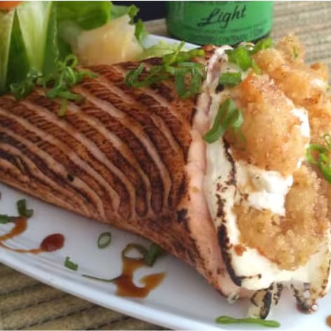 Lamina de salmão massaricado, camarão, salmão e kani crocante, cream cheese, cebolinha, gergelim e molho teryaki.