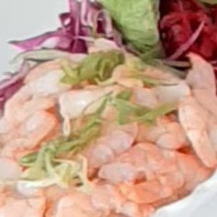Camarão, cebola roxa, cenoura, repolho roxo, pimenta biquinho, pepino e gergelim