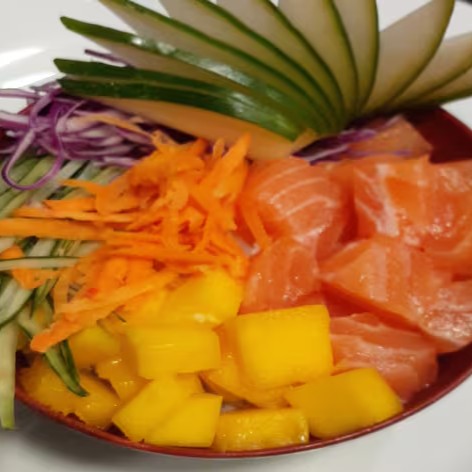 Salmão em cubo, manga, cenoura, repolho roxo, pepino e gergelim