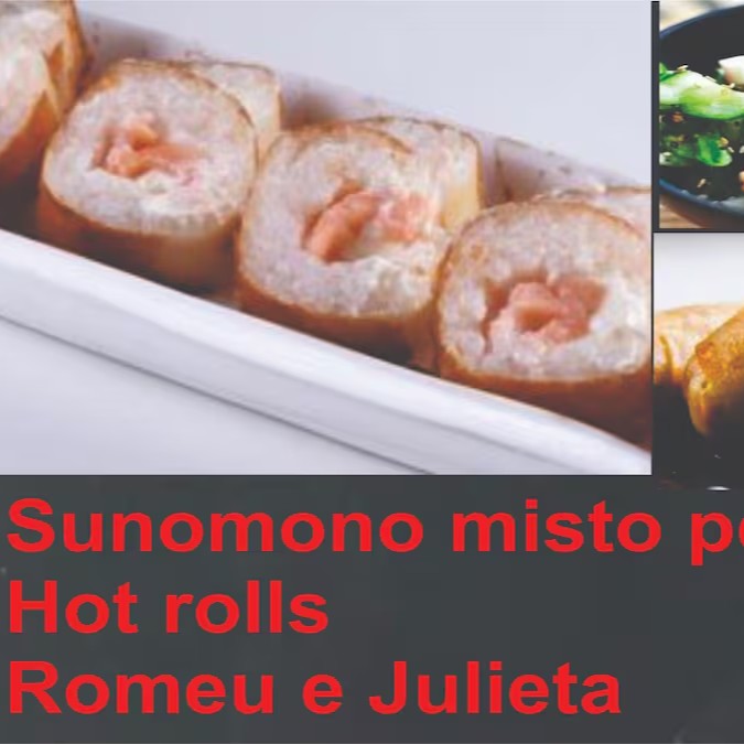 Lâmina de salmão maçaricado, camarão, salmão e kani crocante, cream cheese, cebolinha, gergelim e molho teriyaki. Acompanha Romeu e Julieta especial Dia dos Namorados.
