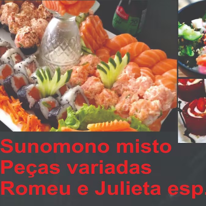 05 sashimi salmão, 10 niguiri salmão, 05 joy joy, 10 uramaki filadelfia, 10 hosomaki, 10 carioca de salmão,se não fizer obs. Vai como esta descrito. Acompanha 05 hots Romeu e Julieta - Dia dos namorados.
