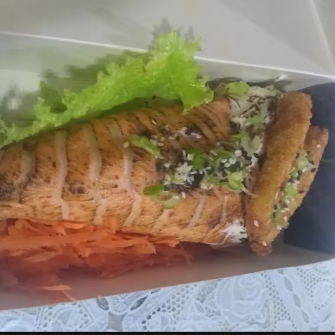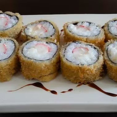 Temaki todo empanado e frito na alga ,arroz , cream cheeser, e salmão