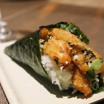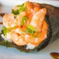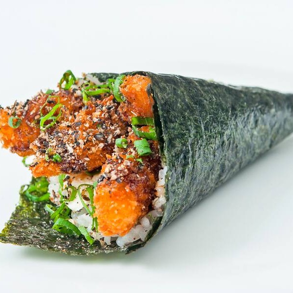 Temaki na alga, arroz, cream cheser ,camarão empanado e salmão cru em cubos.