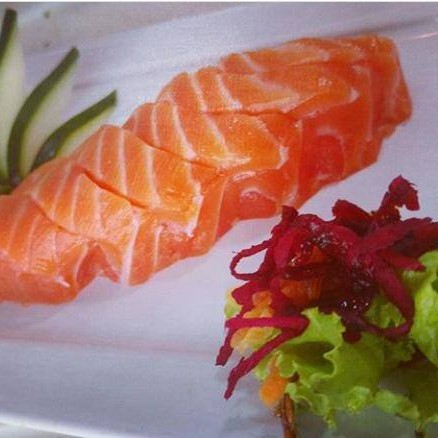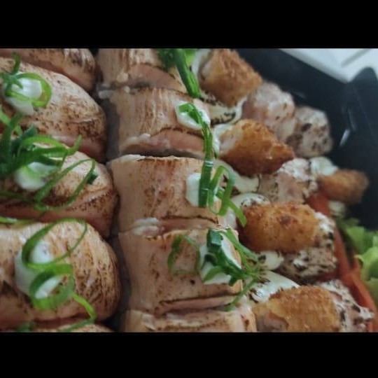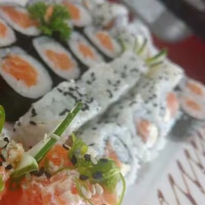 10 uramakis de salmão, 10 hossamakis de salmão, 10 cariocas, 5 sashimi de salmão, 10 crock de salmão , 5 joy joy