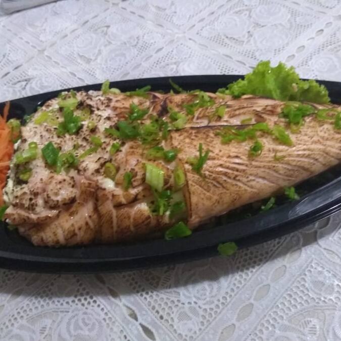 Salmão massaricado envolto com cream cheser e camarão empanado