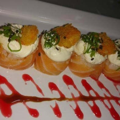 Arroz, cream cheeser, camarão empanado envolto por lâmina de salmão