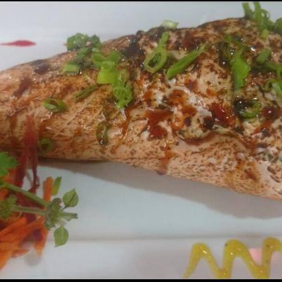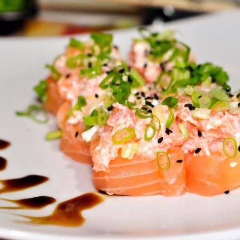 Hot aberto ao meio com cream cheeser e salmão em cubos maçaricado finalizado com cebolinho, gergelim torrado e molho taré!