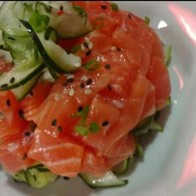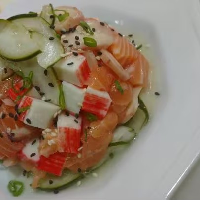 Salada de pepino, salmão,kani,camarão,e gergelim torrado