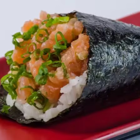 Temaki na alga , arroz cream cheeser, salmão finalizado com gergelim torrado e gengibre!