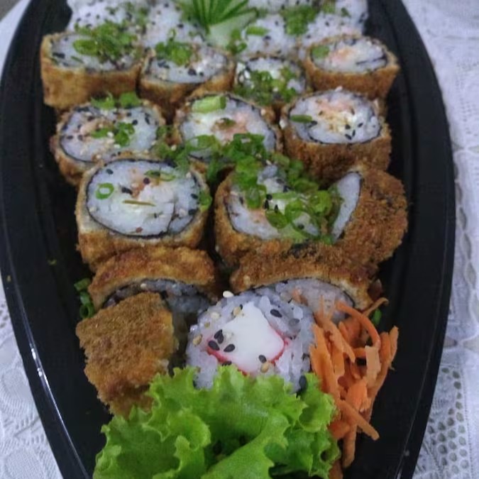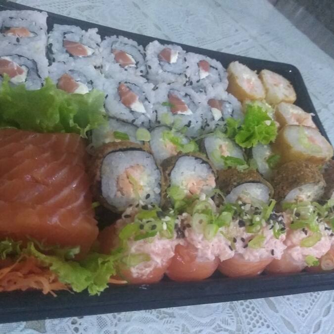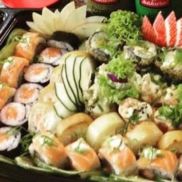 10 uramakis de camarão, 10 hossamakis de kani, 10 cariocas, 3 niguiri de salmão, 2 niguiri de camarão,3 niguiri de kani, 2 niguiri de skin, 5 crock de salmão , 5 joy joy