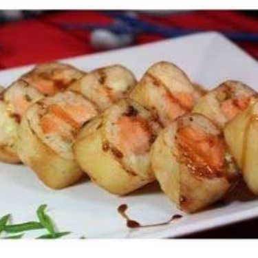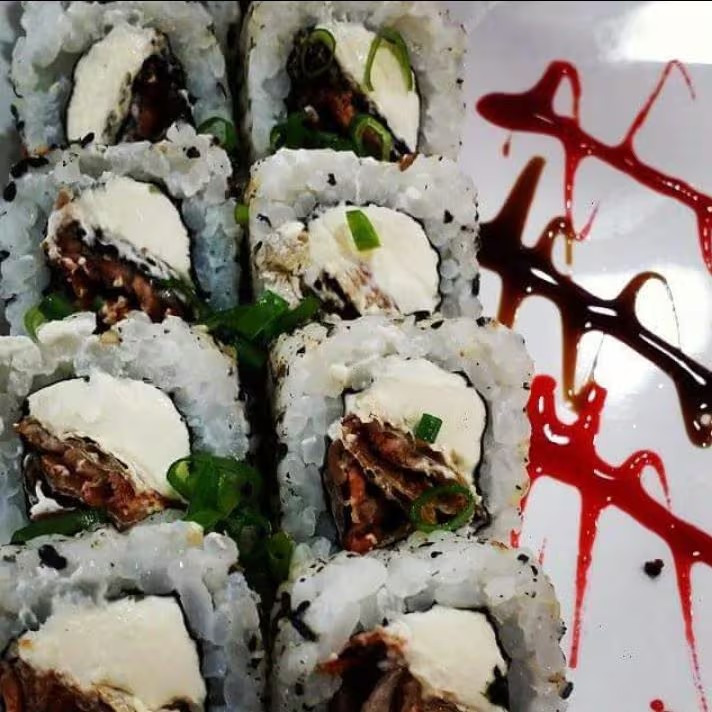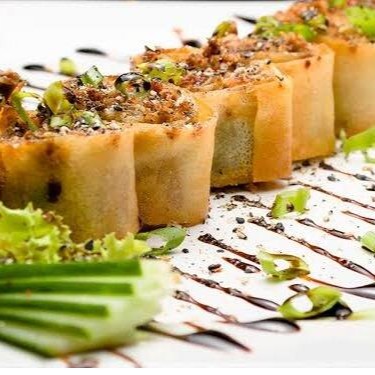 (arroz, cream cheeser, salmão envolto na massa harumaki)
