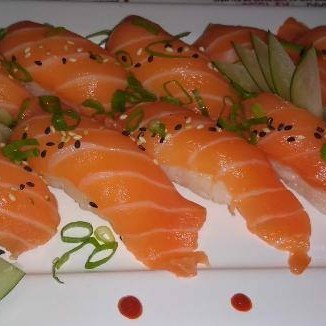 10 uramakis de salmão, 10 cariocas de salmão, 3 joy joy de salmão e 2 lâminas de sashimi de salmão