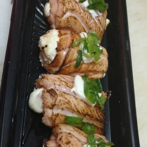 Arroz envolto com lâmina de salmão coberto por pasta de salmão.