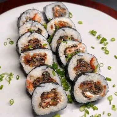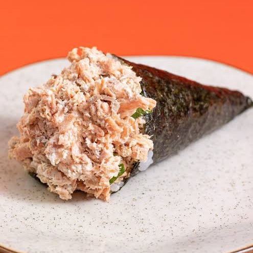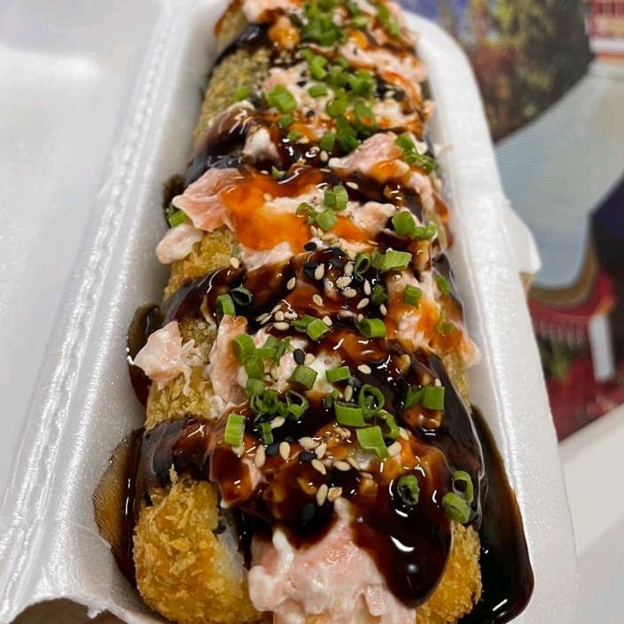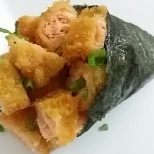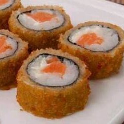 (arroz) enrolado no nori e frito ,recheadode pasta de salmao grelhado e crean cheese,teriaki e cebolinho.