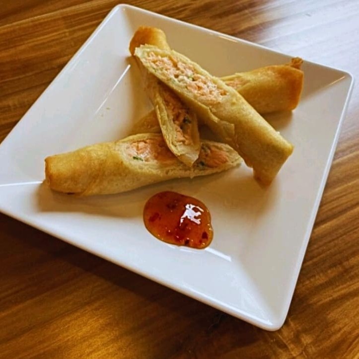 Salmão com cream cheese enrolado na massa harumaki.