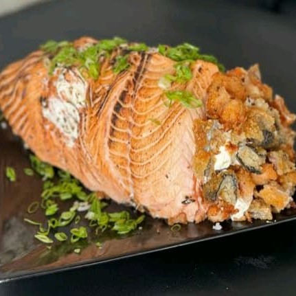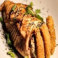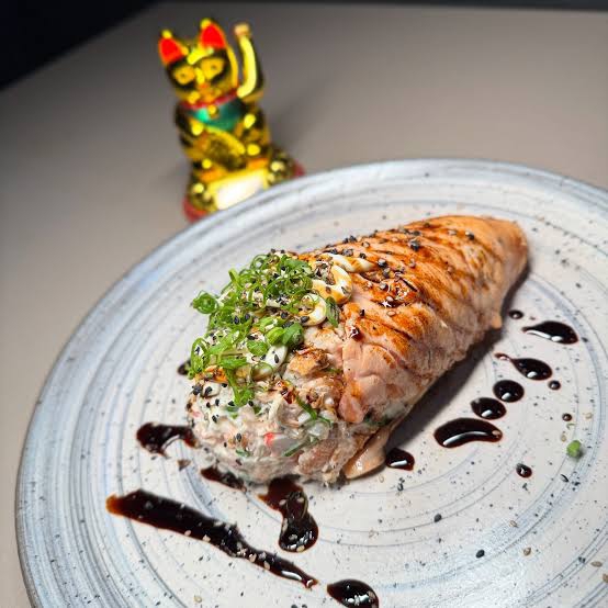 manta de salmao maçaricado,recheado com camarao empanado,crean cheese e cebolinho e gergelin