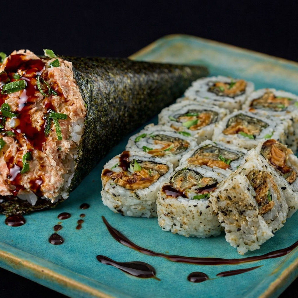 temaki manta de salmao recheado com kani natural e camarao empanados com crean cheese,cebolinho e gergelin