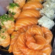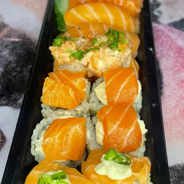 2 temaki de pasta de salmão, 5 niguiri de salmão, 5 hossomaki ebi, 5 hossomaki joy, 10 uramaki de salmão especial, 10 cariocas