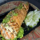 Lâmina de salmão maçaricado com recheio de salmão, arroz e cream cheese