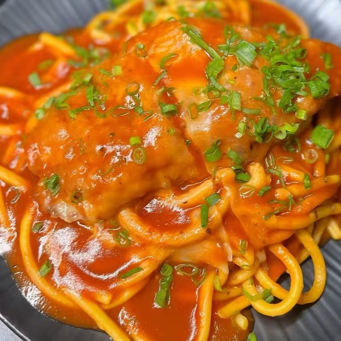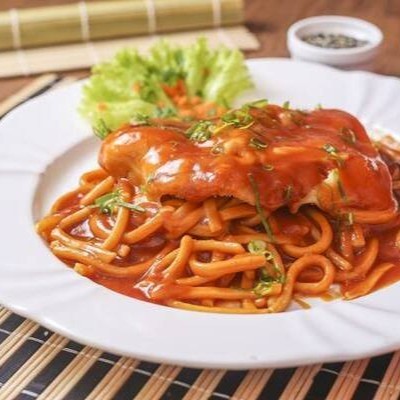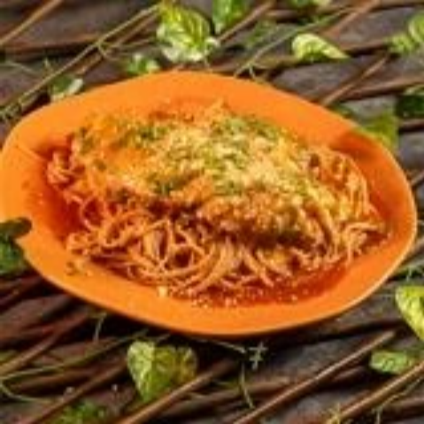 Macarrão, 150 Gramas De Frango Empanado, Queijo E Molho De Tomate.