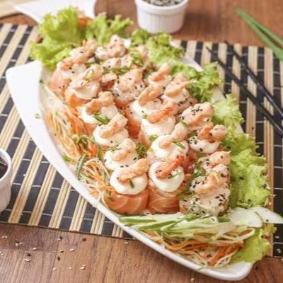 Canapés: Arroz , Pasta de Salmão, cream cheese e Camarão empanado. Ebi: Arroz , envolvido com Salmão , cream cheese e Camarão Natural.