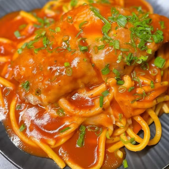Macarrão, Filé De Carne Empanado , Queijo E Molho De Tomate.