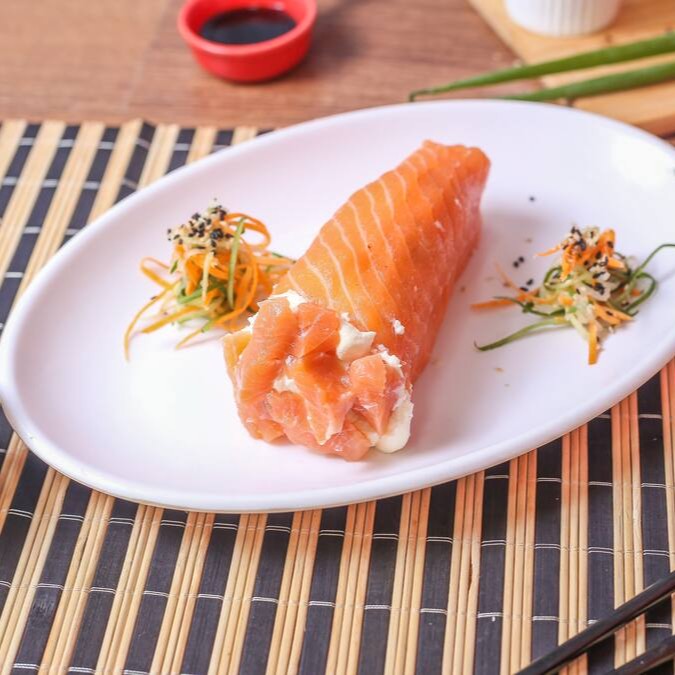 Base De Arroz Japônes , Cream Cheese e pasta de salmão , acabamento com sabor a sua escolha com a manta de salmão . (Acompanha 1 Shoyu, 30ml De Teriyaki)
