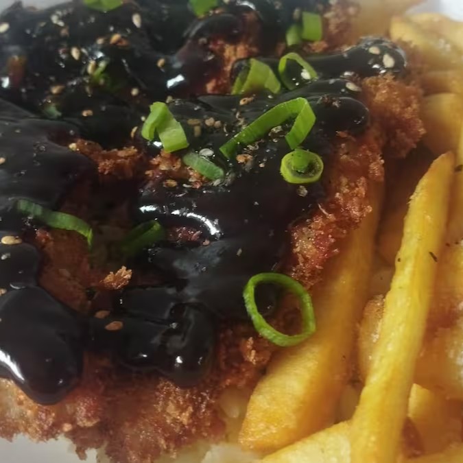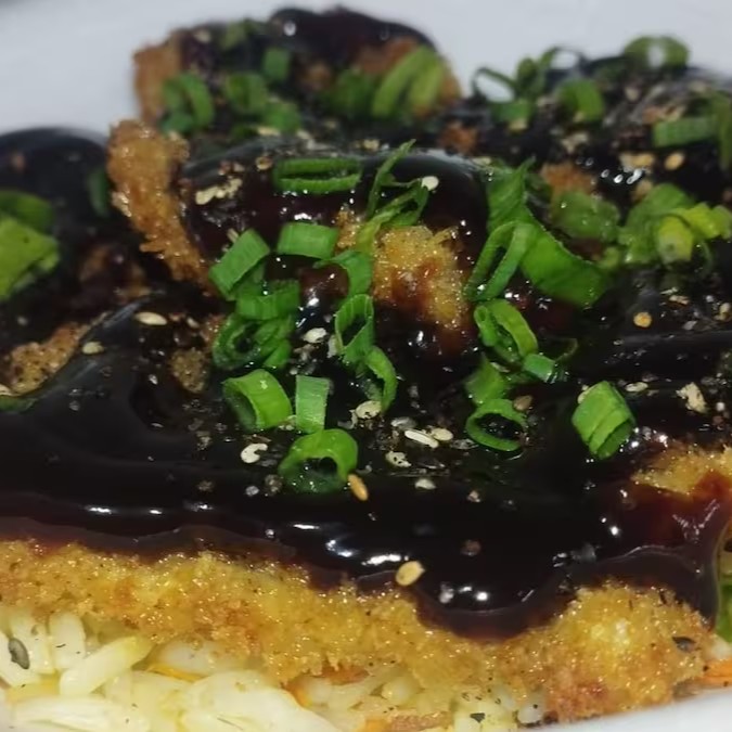 Frango empanado no panko ao molho teriaky, mais complementos.Foto Meramente Ilustrativa.