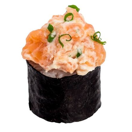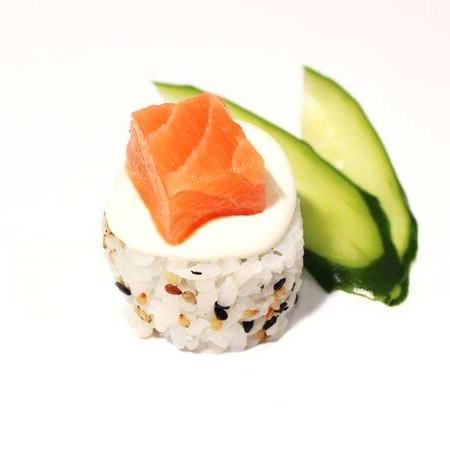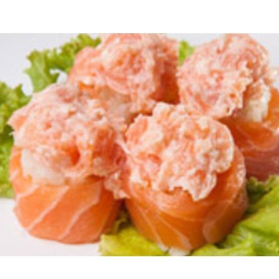 Bola De Arroz, Revestido Com Uma Lamina De Salmão, Recheado Por Cima Com Pasta De Salmão E Cebolinho. (Acompanha Shoyu, Molheira E Hashi).