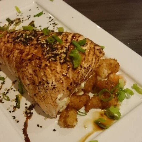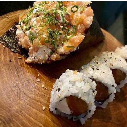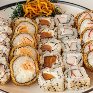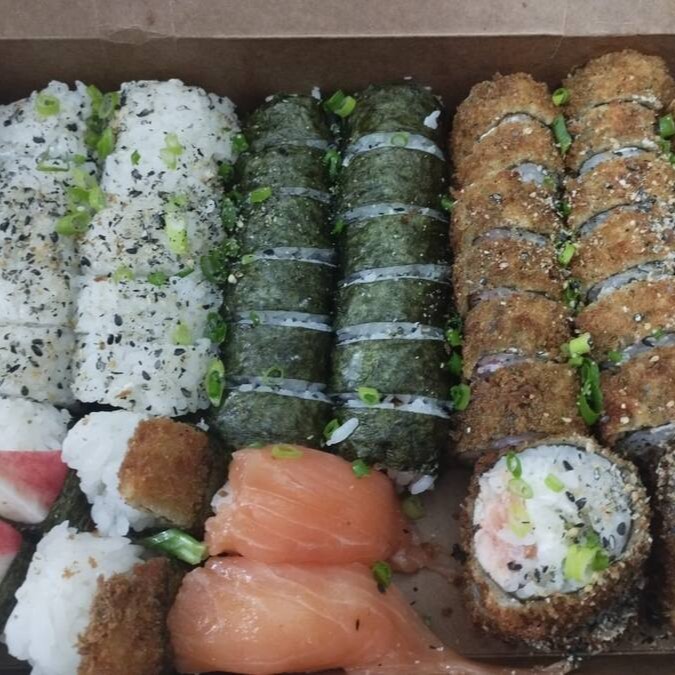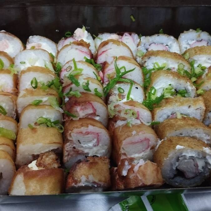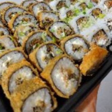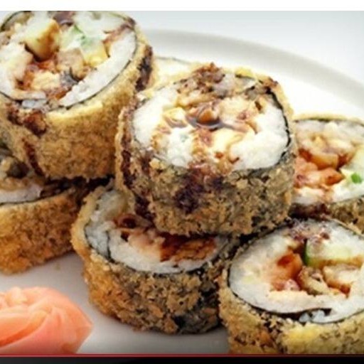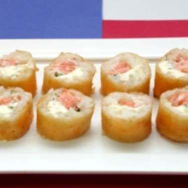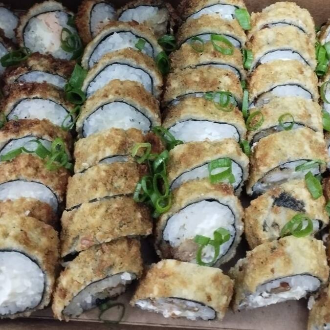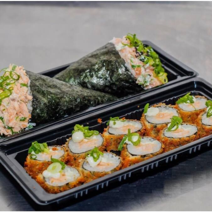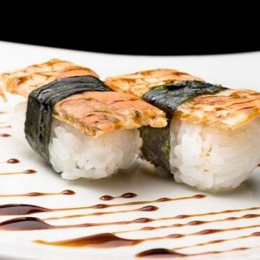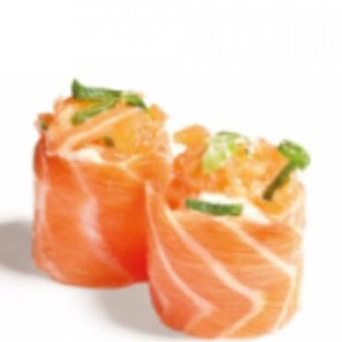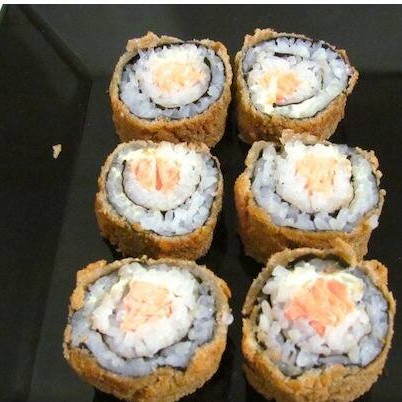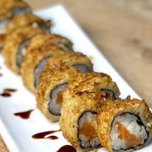 Enrolado de Arroz revestido com Nori, empanado e frito com recheio por cima de cream chesse e Salmão empanado ( Acompanha Shoyu e Hashi).