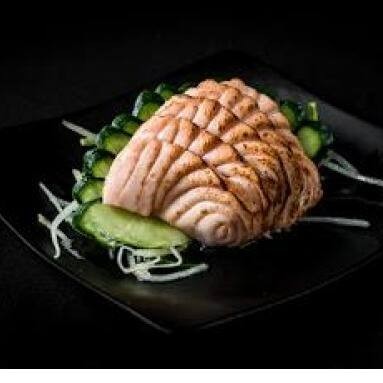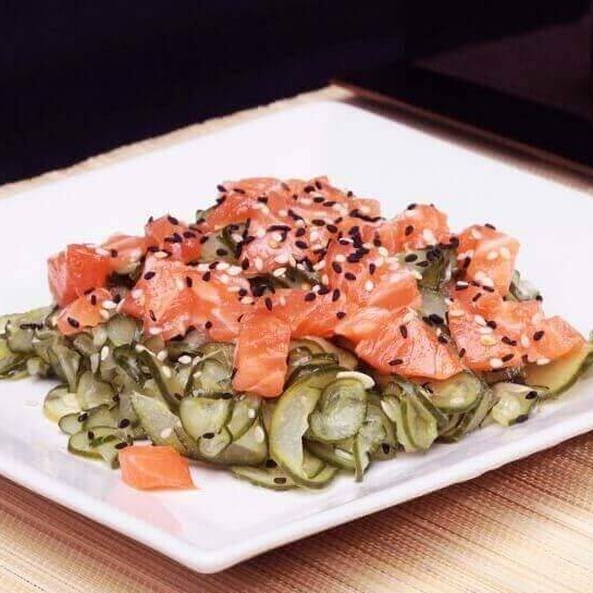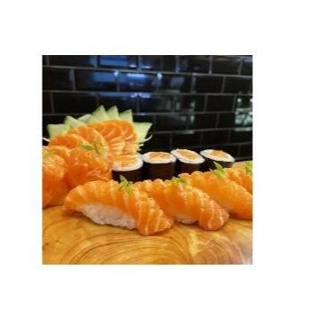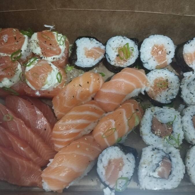 Enrolado de Arroz Revestido com Nori, Com recheio por cima de Pasta De Salmão ( Acompanha Shoyu e Hashi).