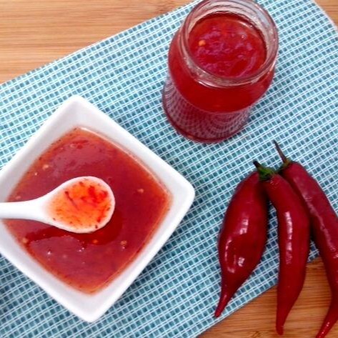Iscas de salmão empanadas e fritas cobertas com geleia de pimenta e acompanhamentos