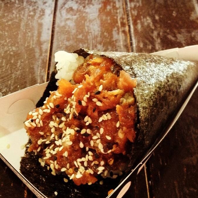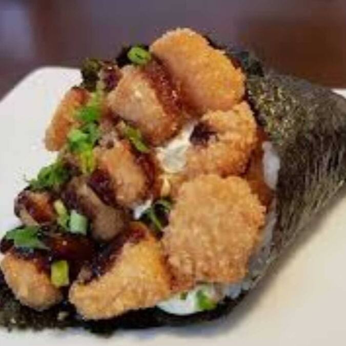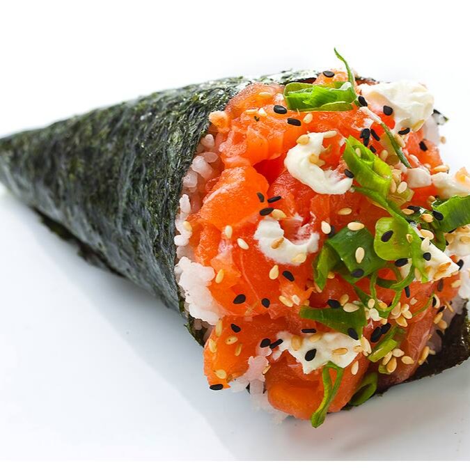 Cone Envolvido Com Nori Recheado De Arroz, Cebola empanada e frita, Cream Cheese, Gergelim E Cebolinha.
