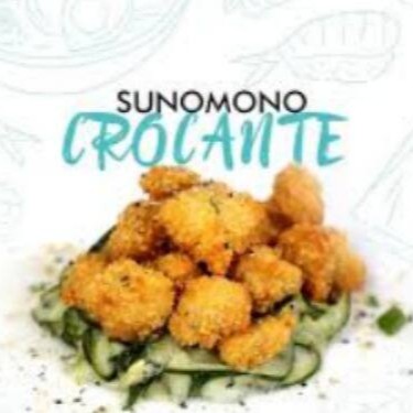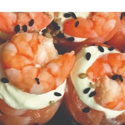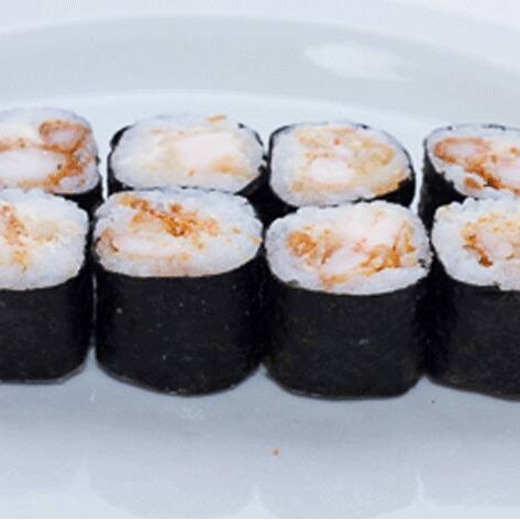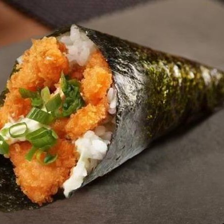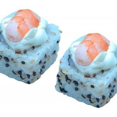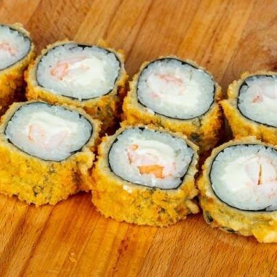 Enrolado de Arroz revestido com Nori, empanado e frito com recheio por cima de cream chesse e camarão cozido ( acompanha Shoyu e Hashi).