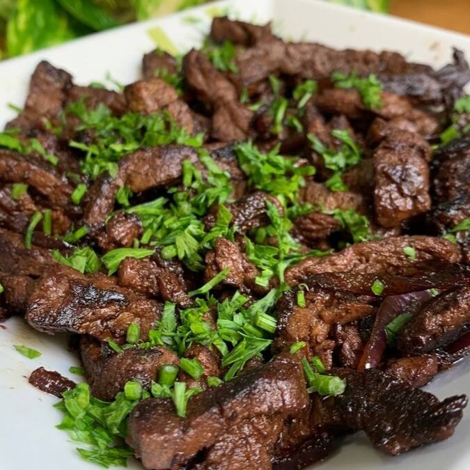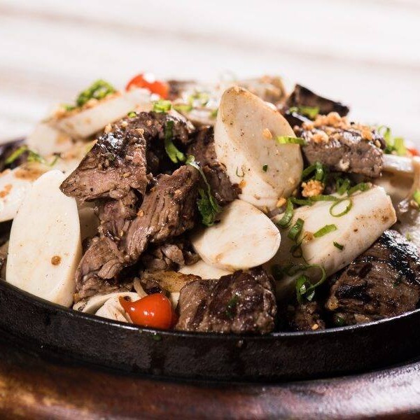 Isca de carne, temperadas, fritas com cebolas refocadas e complementos.Foto Meramente Ilustrativa.