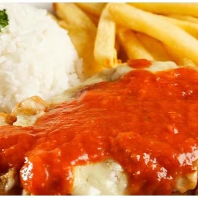 Frango empanado no panko, frito cobertura queijo mussarela, e molho de tomate, mais complementos.Foto Meramente Ilustrativa
