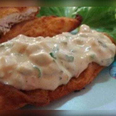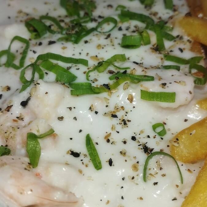 Isca de peixe tilápia empanada no panko ao molho branco, mais complementos.Foto Meramente Ilustrativa.