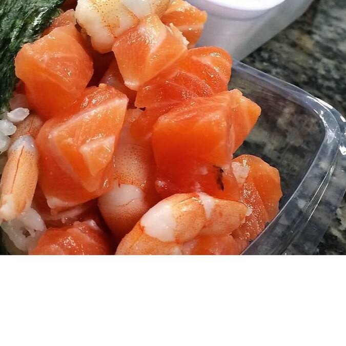 Enrolado de Arroz revestido com Nori, recheio por cima, cream cheese e camarão cozido.