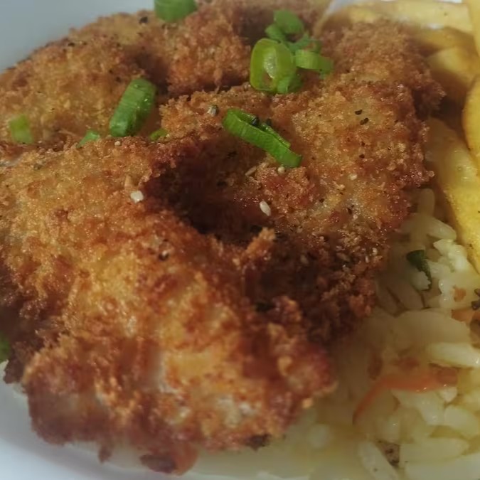 Camarão empanado no panko, frito crocante e complementos.Foto Meramente Ilustrativa.